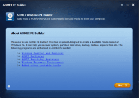 We suggest you to download AOMEI PE Builder first from AOMEI official site, install and run it. Its main interface as following screenshot shows. It is a profile of AOMEI PE Builder and telling you AOMEI PE Builder environment can do many things: recover system, partition hard disk, backup and restore, explorer files and so on. AOMEI PE Builder integrated some programs, click them will jump to corresponding web pages. Click the yellow “Next” button to go.