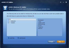 The third step. Choosing AOMEI PE Builder built-in tools to add according to your needs. If they still can’t satisfy your needs, you can add more portable applications by clicking Add Files. What’s more, you can add drivers to pack some drivers into Windows PE. After adding, click “Next” to continue.