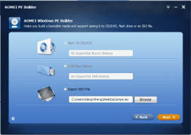 The forth step, select a bootable media. AOMEI PE Builder provides three choices: burn to CD/DVD, USB Boot Device, export ISO file. Now, click “Next” will start the creating task.