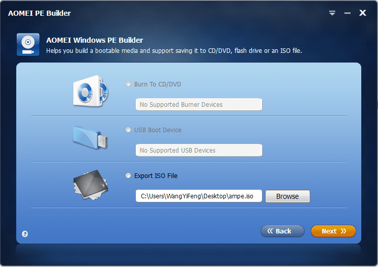 AOMEI PE Builder 2.0 also added dual-boot function: a Windows PE bootable media supports both EFI and Legacy BIOS boot modes and allows to cancel the operation during the process of creating a Windows PE bootable media. It is more compatible and more flexible now. Its built-in tools changed some too. Bootalbe media types are no change, still CD/DVD, USB drive and export ISO file.