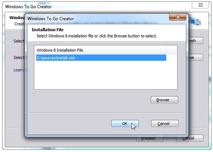 In the next window, you need to click “Browse” to select Windows 8 installation file (named install.wim or install.esd) which locates under \sources folder. If the program doesn’t detect it automatically, please click “Browse” to select manually. After that, click “OK” to continue.