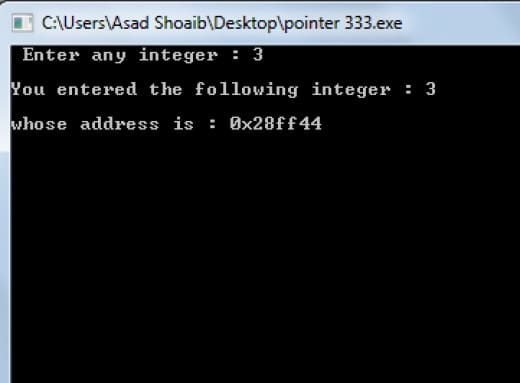 The above program will take input from the user and assigned it to the variable ‘q’ then assigned the address of ‘q’ to the pointer ptr. Then it will show the value of ‘q’ by using a pointer ptr and will also display its address.